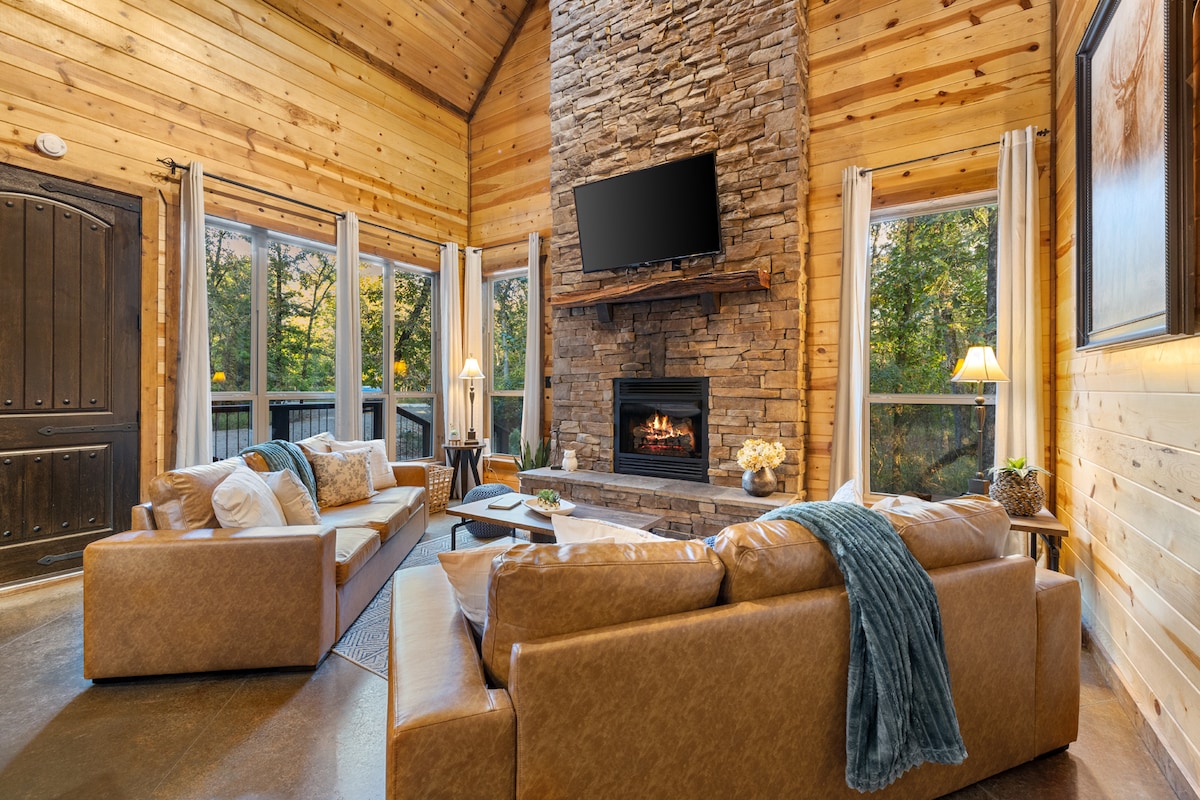 Escape to Nectar’s Ridge, a rustic-luxury retreat inspired by decades of rock-and-roll energy and tucked in the Broken Bow pines. This spacious cabin sleeps up to 18 with three king suites and a custom-built bunkroom with six full beds. Enjoy a private heated pool (additional heating fee may apply), full arcade room, and hot tub under the stars. A private playground, cozy fire pit, guitars, Roku TVs, and high-speed WiFi complete the experience. It’s time to dive into the moment.