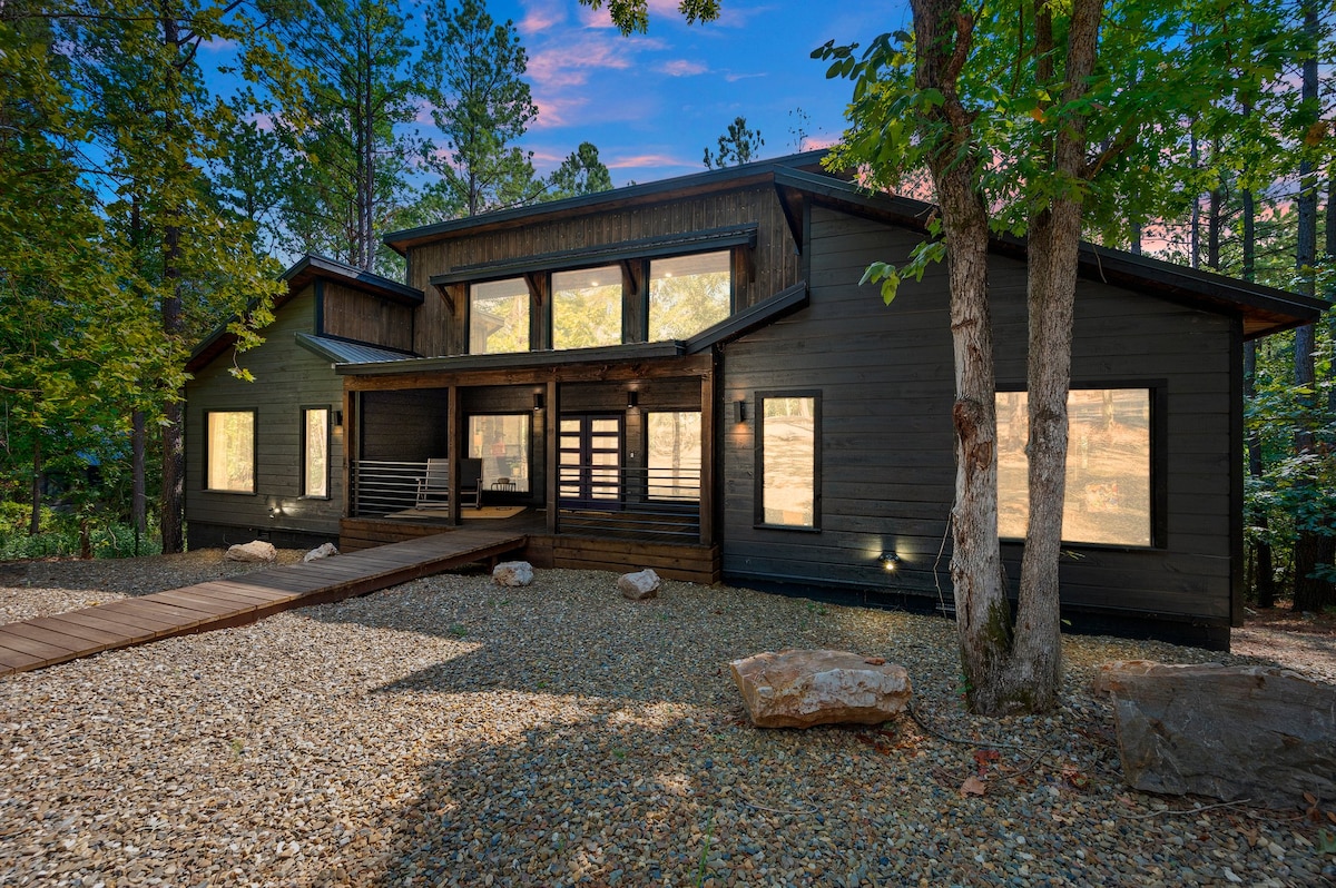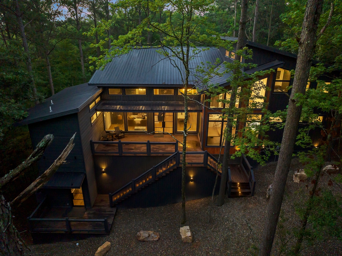 GORGEOUS black modern cabin, luxury amenities. Sucluded location! Sleeps 2 to 14. 3 king rooms, 3.5 baths, an open bunk/game room with 3 stacked bunk beds, open loft bed w/full bed and a full size floor mattress.We personally manage our cabin which means LOWER rates! Situated in the Ouchita Forest with gorgeous mountain and sunset views! Close to Hochatown and short drive to Broken Bow Lake/Beavers Bend State Park.Hot tub, arcade, fire pit, swings, etc.Easy getaway from DFW. Dog friendly max 2