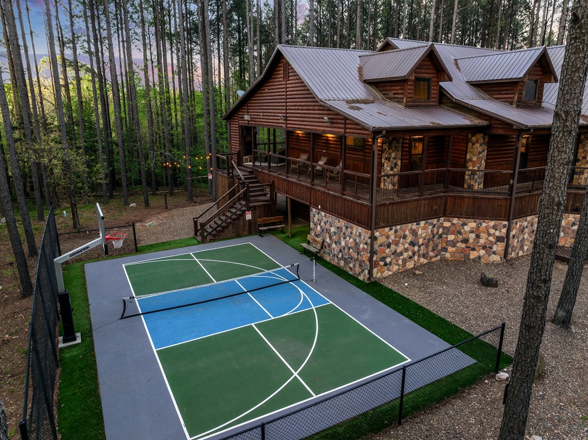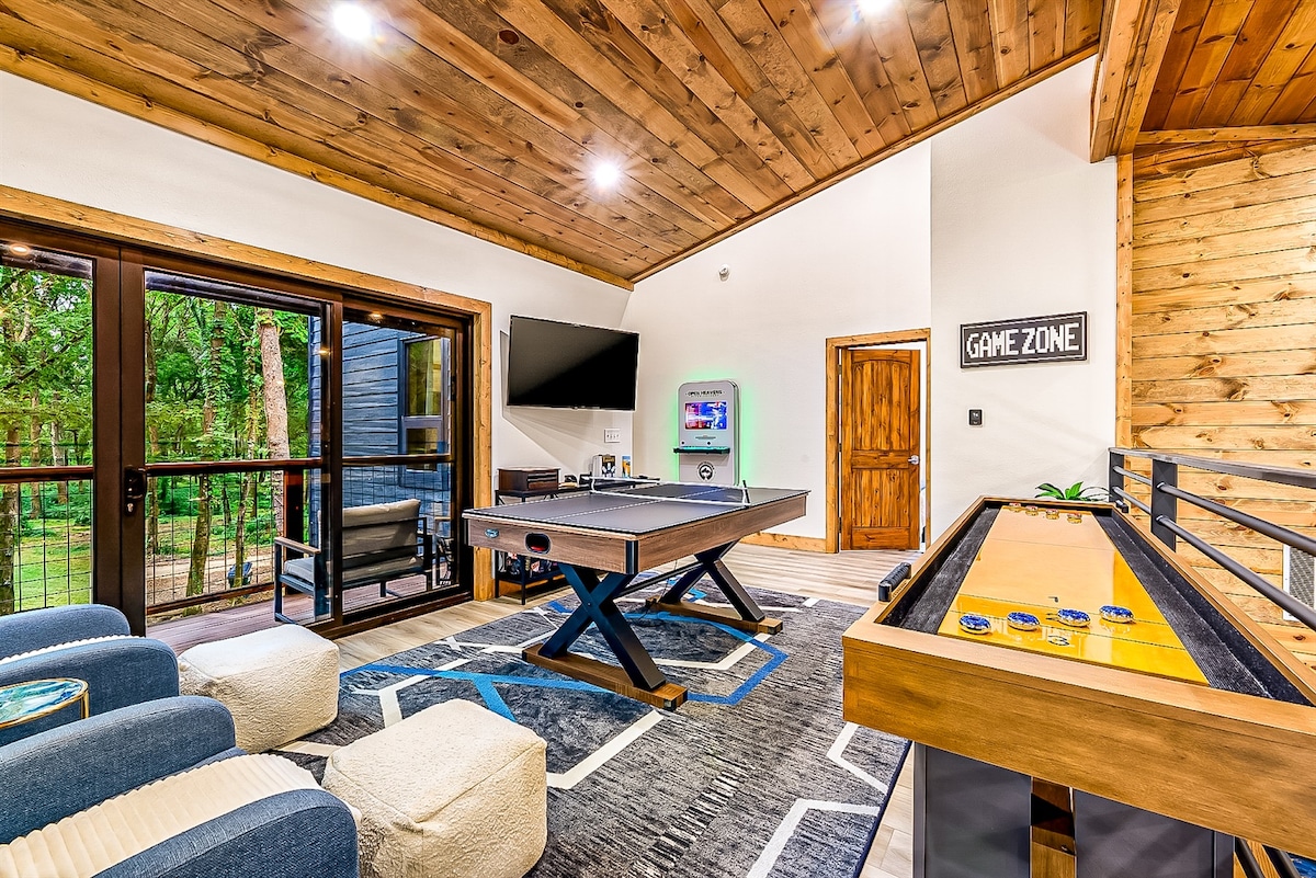 *Wide open floor plan so your group is "together," but not tripping all over each other *A total of 6 bedrooms, one of which is an oversized Bunk Room that sleeps 14 *The other 5 bedrooms have King-Sized beds and full bathrooms *The upstairs bedrooms have a balcony, providing spectacular views of the Oklahoma mountains and forest *Humongous deck with slide and climbing wall attached *Also on the deck is a kitchen with built-in gas grill and 8-person hot tub *Amazing Game Room *Upstairs Loft
