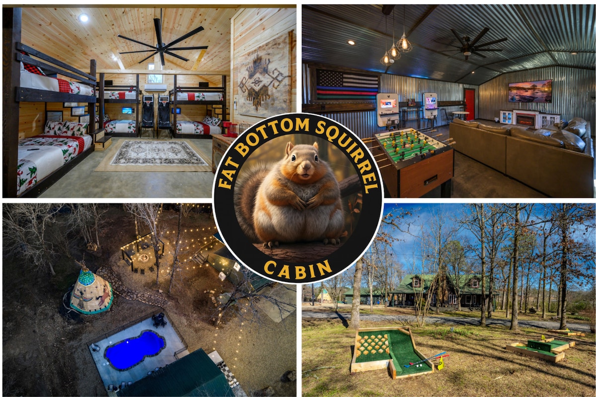 Crooked Elbow Cabin is just North of Broken Bow, OK in Hochatown. Just minutes from Broken Bow Lake, Cedar Creek Golf Course, and backs up to stunning ATV trails. This cabin comfortably sleeps 12, featuring 3 master king bedrooms & a bunk room with 6 beds, and a large patio with a hot tub, grill, and outdoor fireplace. Enjoy the heavily wooded lot, fire pit, cornhole, shuffleboard, and other amenities this cabin offers. Dog Friendly!