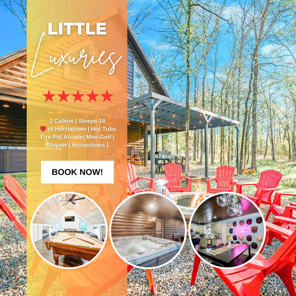 Luxury intertwined with family fun in the Heart of Nature at Delaney Cabins! * Spacious Living Room with Gas Fireplace & 75" 4K SMART TV. * Fully Equipped Kitchen with Coffee Bar & Dining for 16. * 4 Lux Bedrooms with Private Deck Access & Smart TVs. * Lux Spa Bathrooms with Rain Showers & Body Jets. * Expansive Outdoor Area with Hot Tub, Fire Pit, & Games. * Dining & Shopping Options in Hochatown. * Free Onsite Parking for 10-12 Vehicles. Your next unforgetta