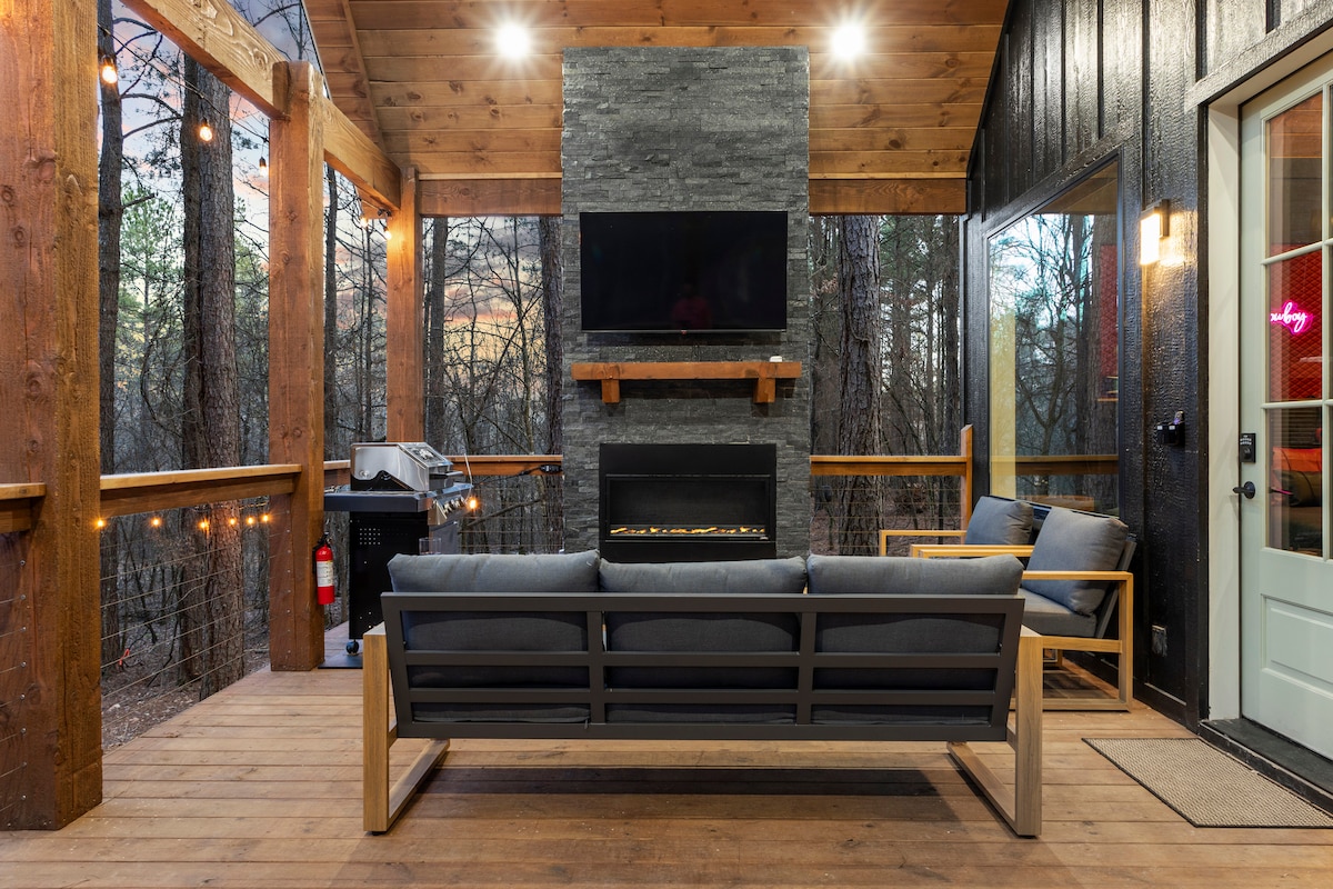 Written in the Stars Luxury Cabin is the perfect romantic couples cabin! 🏠 🤩 Stunning Views! Luxury cabin 30' up in the treetops. 💦 15' WOW walk-in shower plus a clawfoot tub. 🧑🍳 Designer kitchen with gas stove, island, and high-end appliances. 📺 Smart TVs inside and on the wrap-around deck with an outdoor fireplace. 🔥 Hot tub with LED lights and waterfall feature for relaxation. 😴 Sleeps up to 4 guests, perfect for a couple or small family. 🚫 🐶 Sorry, no pets allowed