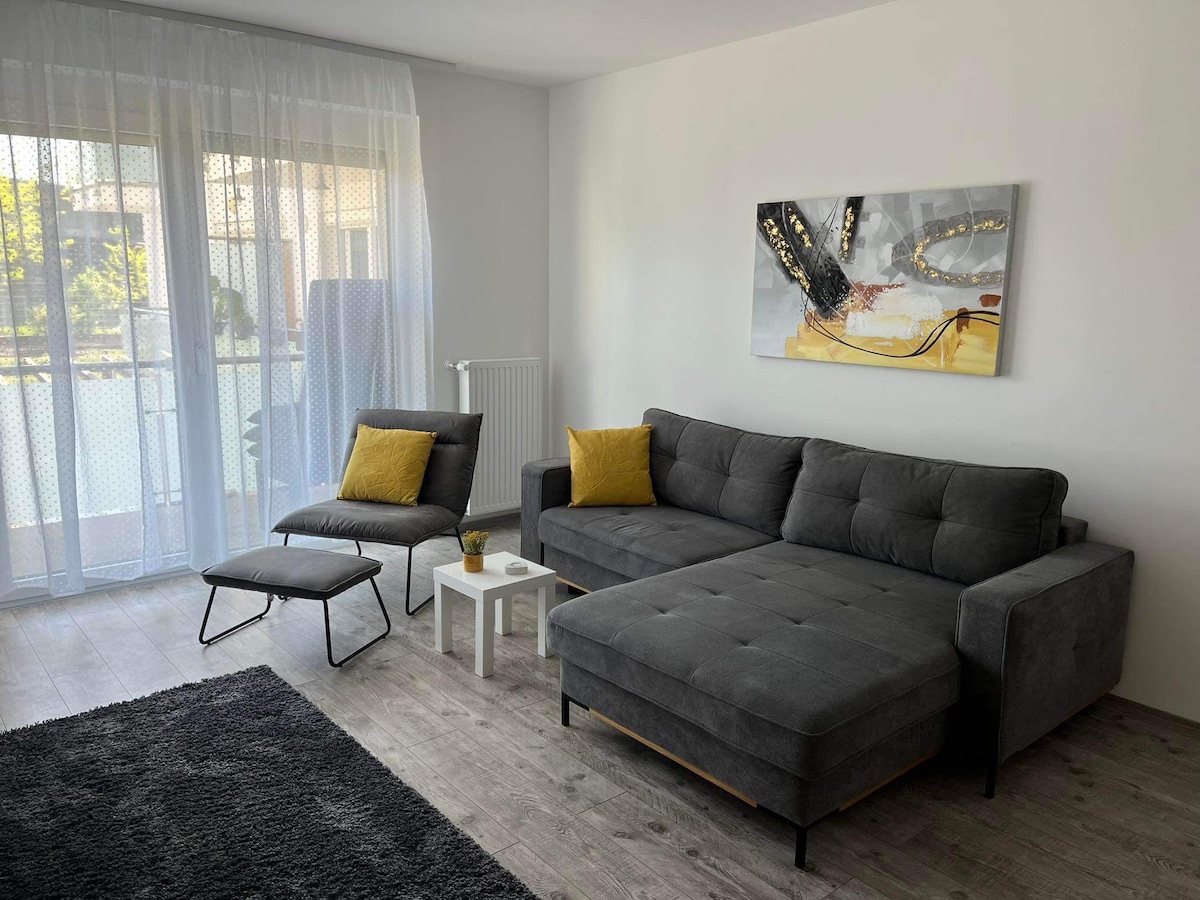 Új építésű,modern, liftes társasház, új bútorzattal, csendes nyugodt környéken, könnyű megközelíthetőséggel, saját gépkocsi pasrkolóval. Házias, privát vendéglátással várom Önöket jól felszerelt lakásban, modern konyhával. Zárt ingatlanon helyezkedik el a ház, kerítéssel védve. Csendes, nyugodt, parkosított zöldövezeti környék, könnyű megközelíthetőséggel. Beszélt nyelvek: német,angol,magyar