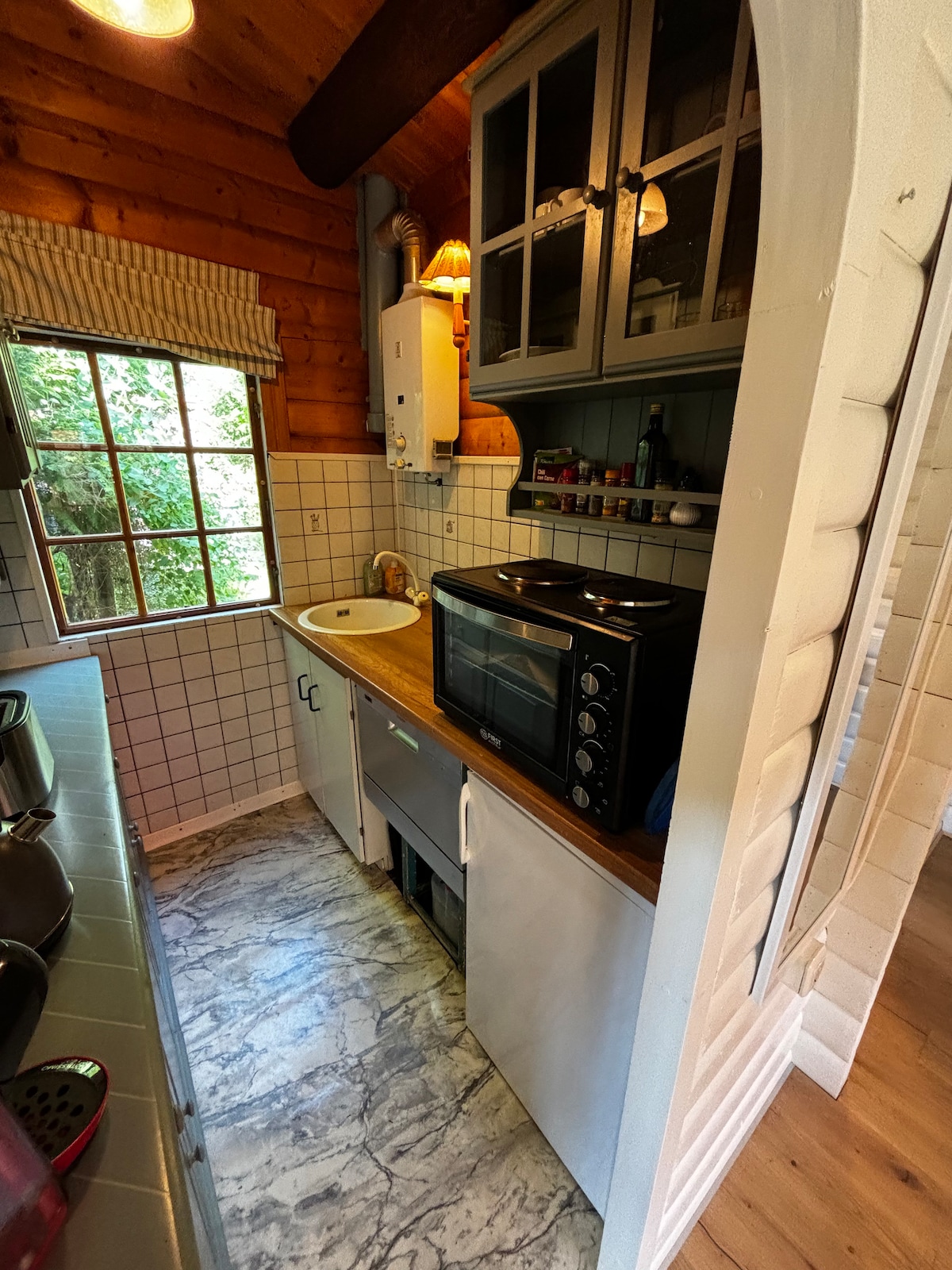 Beautiful log cabin 400m away (approx. 7 minutes on foot) from Lake Bernstein. Very quiet location surrounded with trees and beautiful small holiday homes. The garden is overgrown with plants so that it cannot be seen in from outside and is exclusively available. A Gasgrill and fireplaces both inside and outside with wood is included. Whirlpool (75€ / stay; April-Oct.) and sauna (25€ for / night; all year) can be booked for additional cost. A Carport for one car (up to 2 m high) is available.