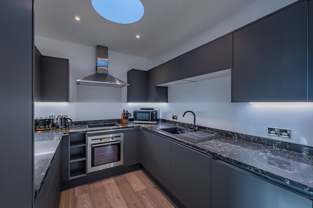 Luxurious and Light-filled Two Bedroom Penthouse in Central Bromley, close to train stations, restaurants, bars and shopping. Split-level layout, with two bedrooms, two en-suite bathrooms, open plan living and dinning area with stunning eighth floor views across London. Newly installed kitchen and sofas/chairs in lounge, with wifi throughout and three Smart TVs, Sonos music system and even Magic Mirror and exercise floor space with free weights and kettlebell to work out in the morning with.