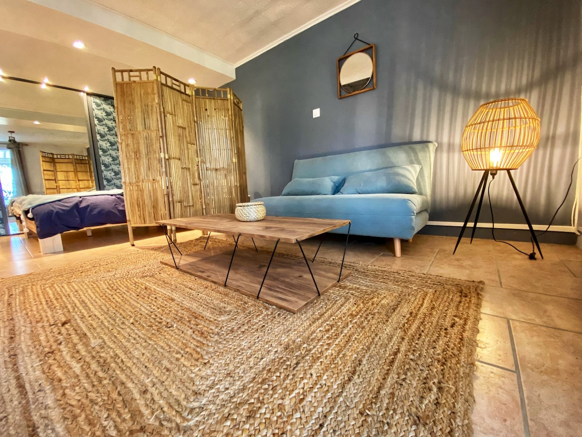 L'Appart de Fanny, 42m², a été entièrement rénové. Il se compose d'une pièce à vivre avec coin TV et canapé lit, d'une cuisine ouverte entièrement équipée, d'une grande chambre avec lit de 160 (ouverture sur la pièce à vivre par une verrière), et d'une salle de douche. Possibilité d'un lit parapluie dans la chambre. La baie vitrée s'ouvre de plain-pied sur le jardin où sera aménagé un coin barbecue juste pour vous (quand la saison s'y prête) .