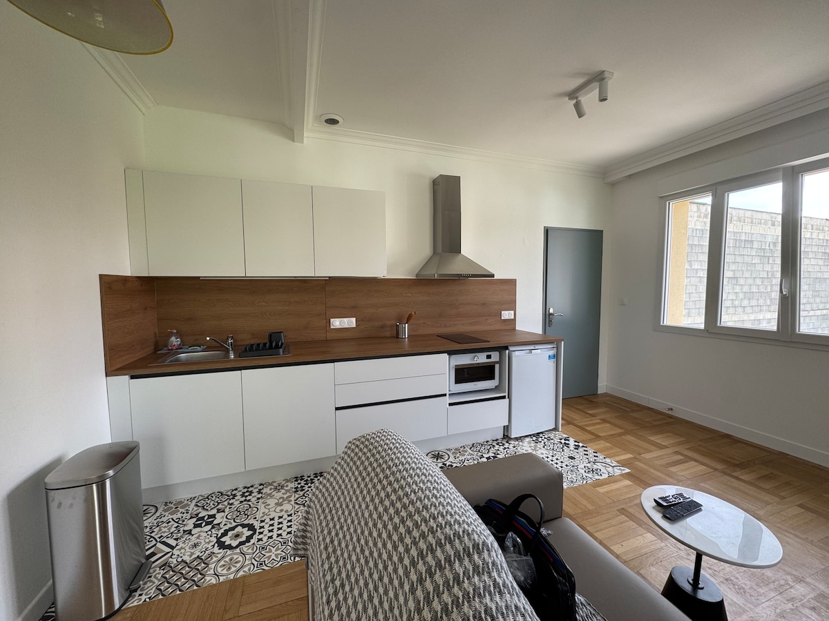Charmant T1 rénové avec place de stationnement privé dans résidence sécurisée. Capacité 3 pers Placement idéal: proche centre-ville, transports, Eurexpo et hôpitaux. Salon lumineux avec canapé convertible 2 places (matelas 20cm inclus), table à manger, TV connectée, fibre, Wi-Fi. Cuisine équipée, plaque de cuisson, machine à café, four micro onde, réfrigérateur et congélateur. Une chambre avec un lit simple, espace de travail et rangement. Salle de bain avec cabine de douche et WC.