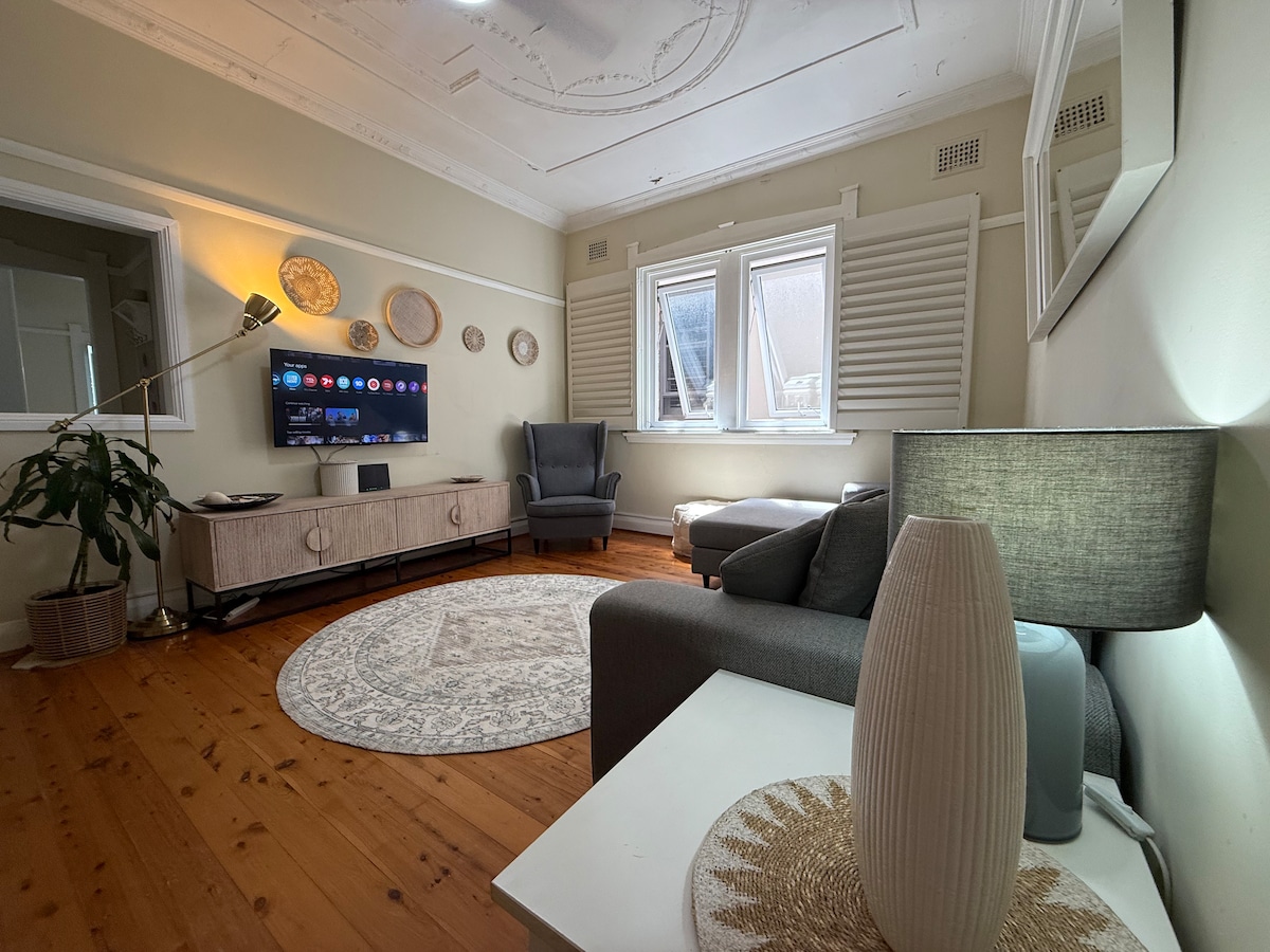 Tucked away on a peaceful street, our chic apartment is a retreat moments from the area's best coffee shops and 15-min walk to iconic Bondi Beach Enjoy the homely charm of our ground floor art deco haven boasting garden access. While the apartment naturally stays cool, we've got fans on standby. There's a queen bed, a double bed in the study and an air mattress that fits in the living room. Comfortable stay for 2, but have had 3 and 4. Well trained pets welcomed