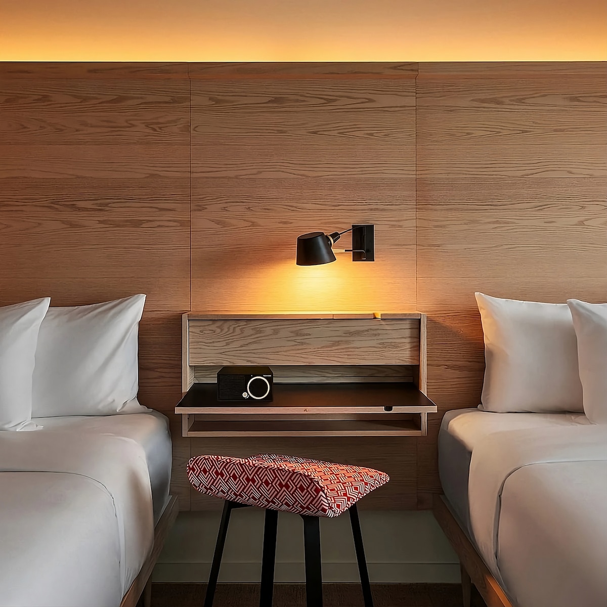The Standard King offers 225 square feet of contemporary comfort, featuring a plush king bed, high-speed Wi-Fi, and a 43 inches Smart TV. Custom black-out curtains and individual climate control ensure a restful stay for our guests. Enjoy thoughtful touches like a mini-fridge, bedside USB charging, and modern furnishings. With premium bath amenities and attentive service, you will have everything you need to unwind and explore New York City with ease.