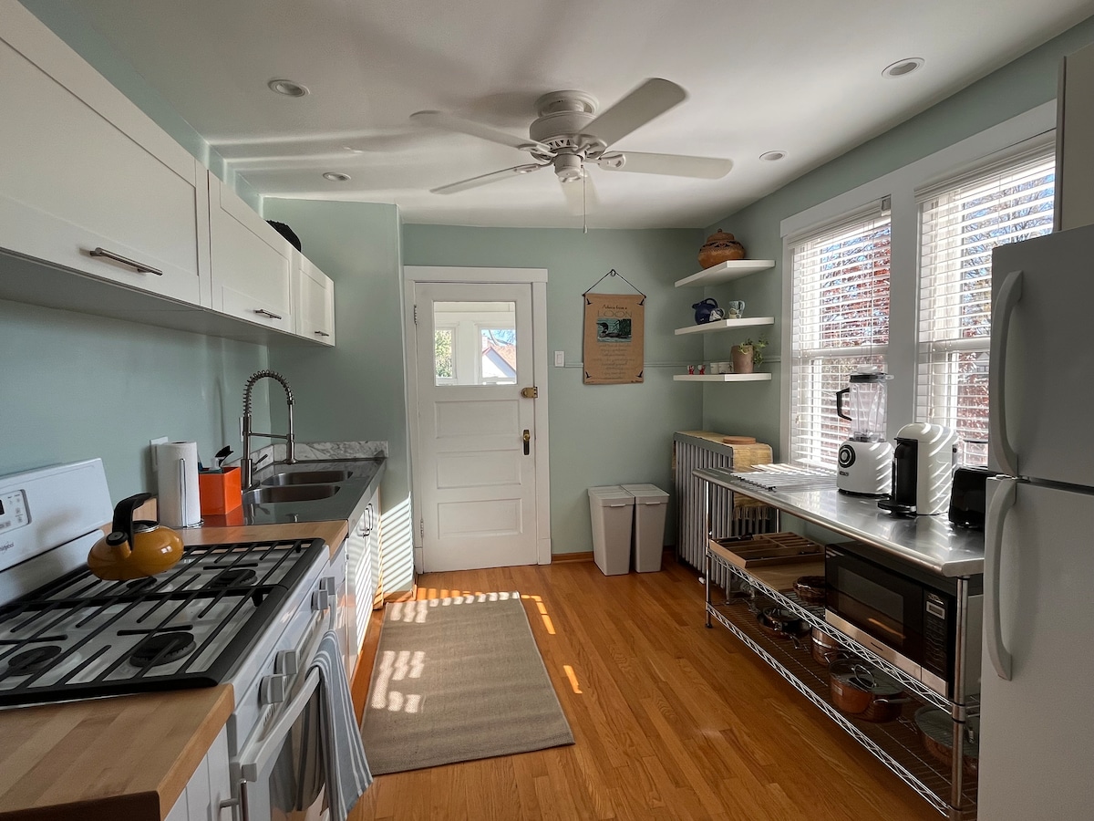 This sunny second floor apartment perched in an 1890’s farmhouse offers traditional charm with many contemporary touches. It showcases a variety of original art. Located on a quiet street but just steps away from restaurants, bars and shops, off-street parking is included. Two nearby trains provide easy access to downtown Chicago and O’Hare Airport. An enclosed porch directly off the kitchen overlooks a beautiful prairie garden. You can relax on the backyard patio with gas grill and fire pit.