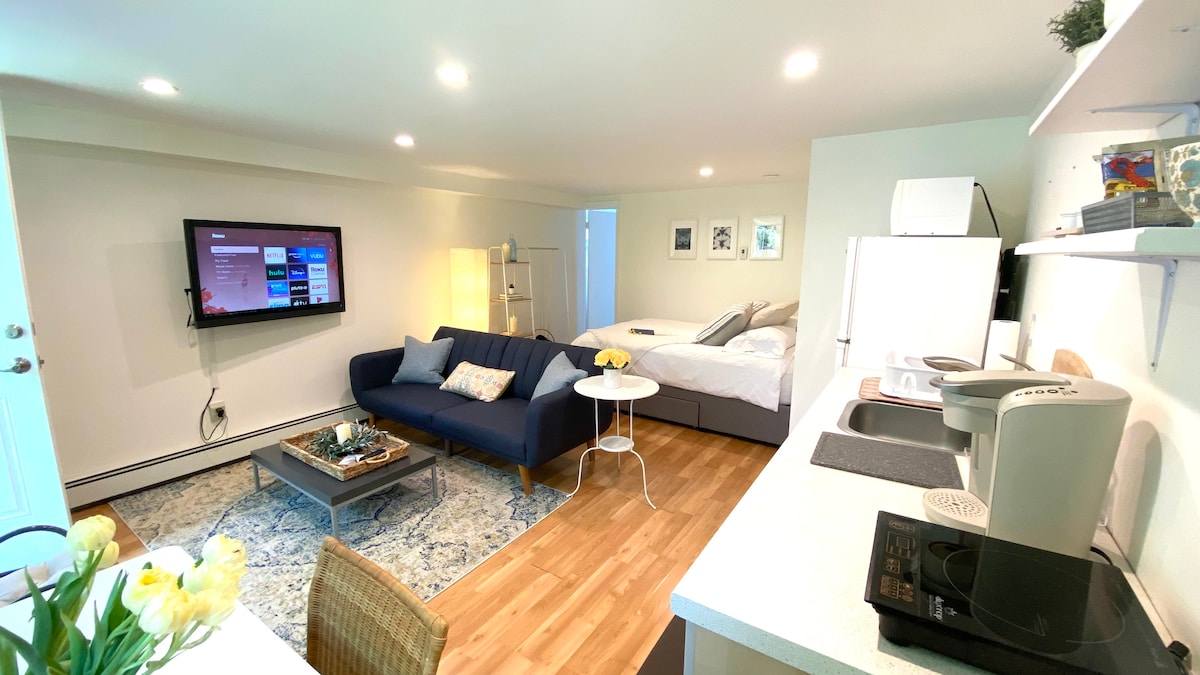Welcome to our cozy guest suite nestled within walking distance of the Fire Island ferries and conveniently close to local amenities! This private unit, attached to the main part of our home, offers a comfortable retreat for your stay. Step through your own private entrance into a welcoming living room, where you can unwind after a day of exploration. The bedroom features a queen-sized bed, providing a restful night's sleep, and an adjoining bathroom offers convenience and privacy.