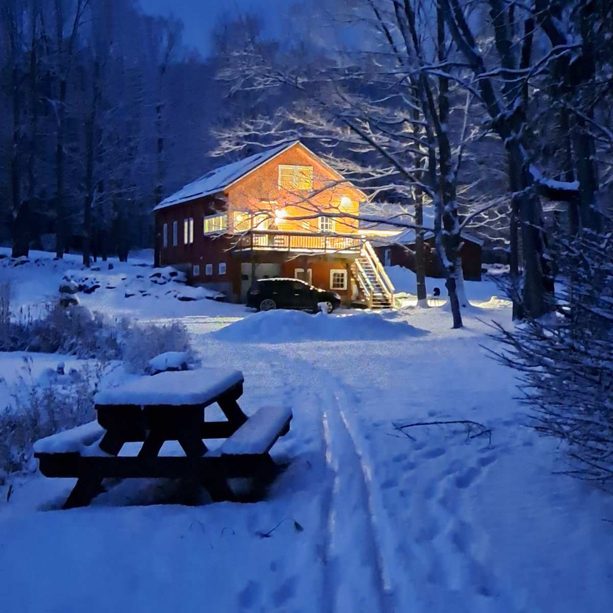 Rennsli Cabin is off grid + nestled on a forested plateau in the foothills of the Green Mountains. You will feel like you are in the middle of nowhere, unplugged and able to regenerate. Kitchen is equipped with cooking essentials, water, coffee, tea, milk, fresh eggs + homemade soap. It has an indoor compost toilet, outhouse + outdoor shower (May-Oct) Most seasons, the cabin is 100ft from parking, but weather conditions may require an 800 ft walk from parking at main house.