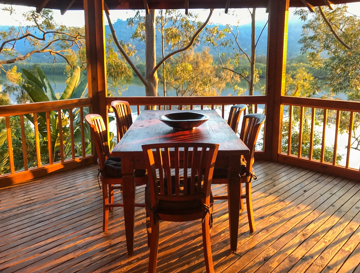 Perched on a sloping block among the tree tops, with views of the Hawkesbury River, Broken Bay and surrounding National Parks, this unique home is a place to relax and let go of the world. High ceilings, floor to ceiling glass and an open plan layout allows you to enjoy the surroundings, no matter what the elements. We are located on the east side of the island where you can watch the first rays of the day rise above the surrounding clifftops.