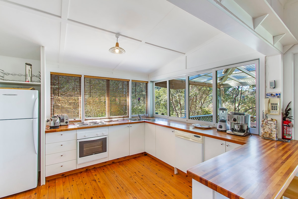 Romantic character filled holiday retreat. Views of Patonga beach & Broken Bay, ideal for couple/family. Bright, fresh; aircon, log fire, full kitchen, outdoor deck for alfresco dining, hammocks for relaxing. Secluded, 2 min. walk to Boathouse hotel, beach & National Park. Full bathroom plus 2nd toilet downstairs with shower & laundry. Gas BBQ and parking space. PLEASE NOTE: Steep and uneven steps down to house and caution is needed especially when arriving in the dark or in rainy weather.