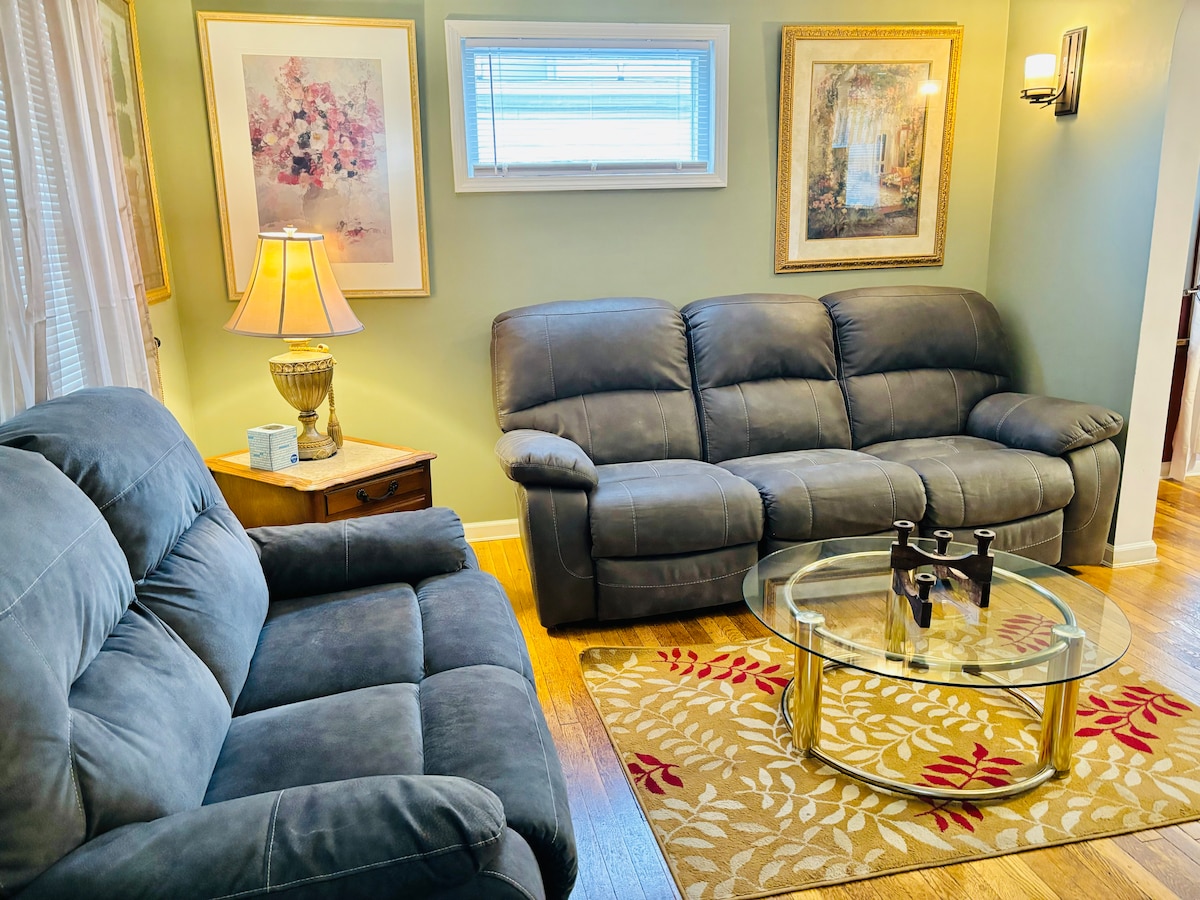 Renovated in 2021, this home's unique industrial touches add to its modern look. The home includes 3 bedrooms, featuring king, queen, and full size beds. There is a futon in the basement and a living room couch that can accommodate two additional people. The home is spacious, offering two areas for people to lounge, one on the first floor and the other in the basement. The basement includes a television, "bar" area, and a workstation.