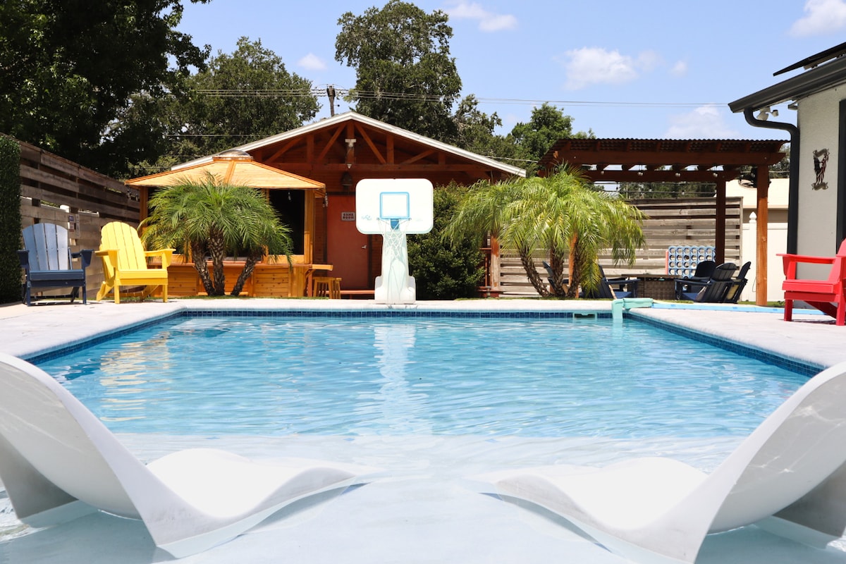 Welcome to the sunshine state. Beautiful 3400 + sq ft luxurious cabana pool home. HEAT INCLUDED. Pool area surrounded by the home. The home is designed in a tropical/coastal casual vibe. Spend your days lounging poolside, nights listening to natures symphony. Breathtaking crystal clear Rivers, Springs and Beaches nearby. Totally private yet In the heart of Springhill near many restaurants, shops and activities. Pin locks 5ft up on the top of all exterior doors to keep the little ones safe.