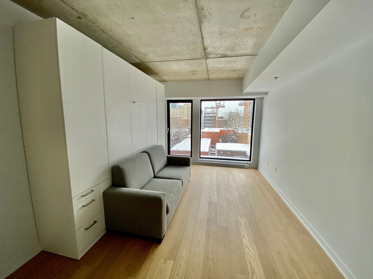 Super new studio, furnished, on the top floor, for rent! 2 steps from St-Laurent metro, UQAM and the Latin Quarter Very well located on St-Catherine Street between Place des Arts and the Village at the intersection of St-Elizabeth Street Fully furnished: bed with mattress, fridge and freezer, oven, dishwasher, microwave, washer and dryer Rooftop terrace, gym and co-working space