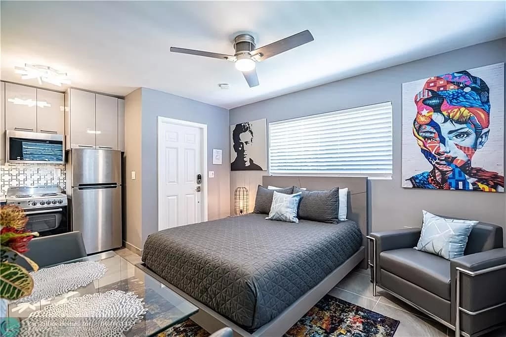Fully renovated, modern efficiency apartment with a comfortable queen size bed and equipped kitchen is located in desirable East Wilton Manors. The apartment is located in a triplex with a common area that includes a shared, year-round heated, saltwater pool and laundry room shared by the three units. High speed Wi-fi internet is included for enjoyment during your stay.
