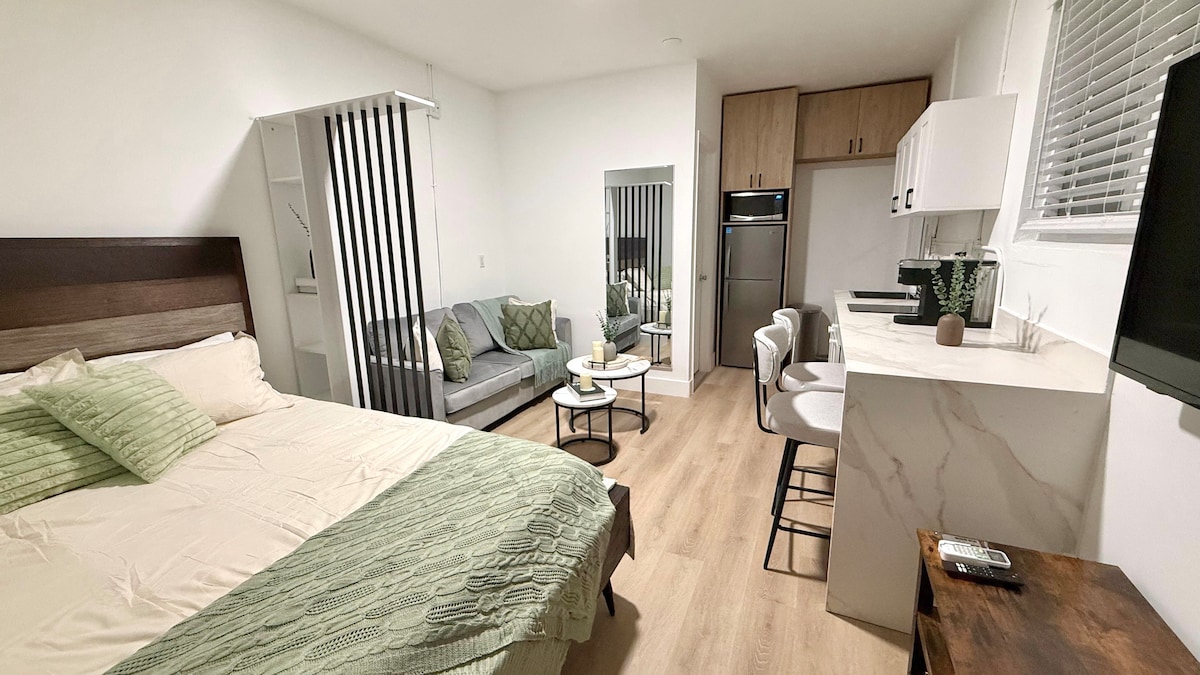 Enjoy a modern, ocean‑inspired loft just steps from Hollywood Beach – a relaxed retreat for couples or small families. - Sleeps 2 | 1 bedroom | 1 bed | 1 bath - Steps to Hollywood Beach & Boardwalk - Modern kitchenette with stove & mini fridge - 40‑inch Roku TV in cozy living area - Open office desk & chair for work or study - Shared coin‑operated laundry & washer/dryer - Crib, high chair & toys available at no extra cost