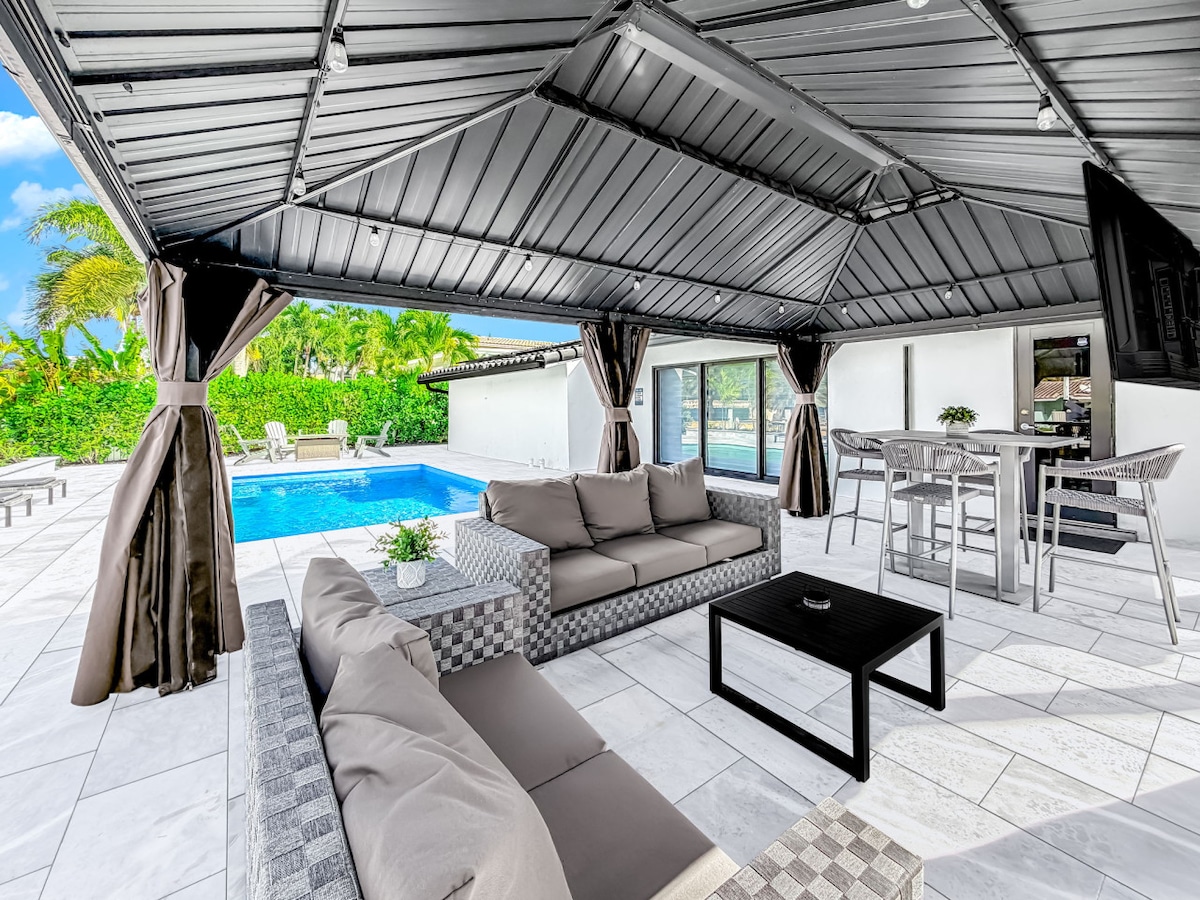 This recently renovated home has been carefully designed with the vacationer in mind. Located just north of downtown, this home features a huge resort style backyard to enjoy. The backyard includes a private pool, huge outdoor deck and dining area, tanning net, a gazebo with an outdoor TV, and even an outdoor refrigerator to store your drinks. This home is located just 15 minutes from Las Olas, the beach, and Wilton Drive. Ready to relax in the backyard oasis? Book with us today!