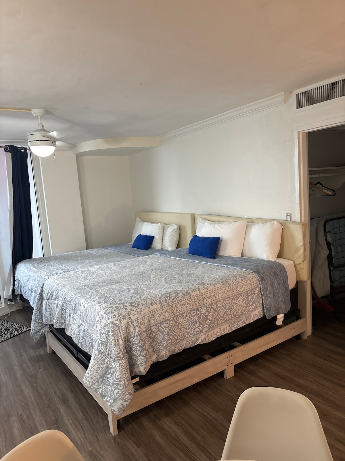 Studio condo right on Fort Lauderdale Beach. 1 queen size bed and a bathroom. Kitchenette area has toaster (no microwave), coffee maker, stove, and fridge. Tons of eating and shops within walking distance or enjoy the tiki bar and restaurant on site. You will enjoy being directly on the beach here. Walk out back and you’re in the sand. City view. There is a $50 one time resort fee.