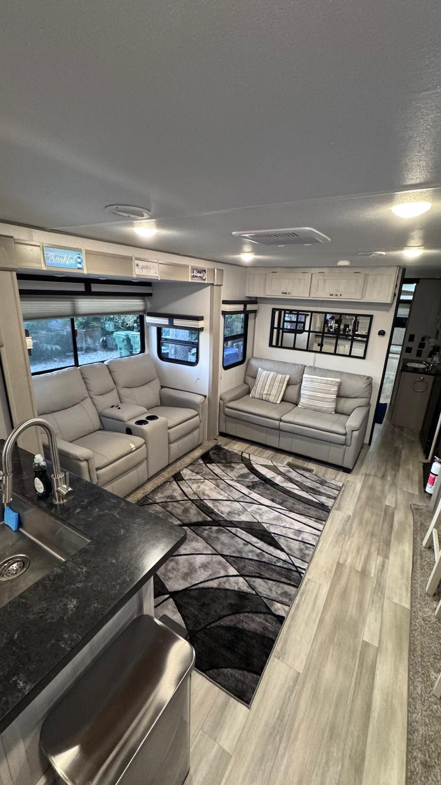 Backyard Glamping! Perfect for couples or solo travelers. This modern camper has all the amenities needed for a comfortable stay away from home. Features rear corner bunk beds with storage, a Queen bed with an overhead cabinet, and a booth dinette that converts to a sleeping space. A modern kitchen with everything you need to dine in! Please note the gas stove and oven have been disabled for safety, replaced with an induction cooktop. Great Monthly Rates Available!