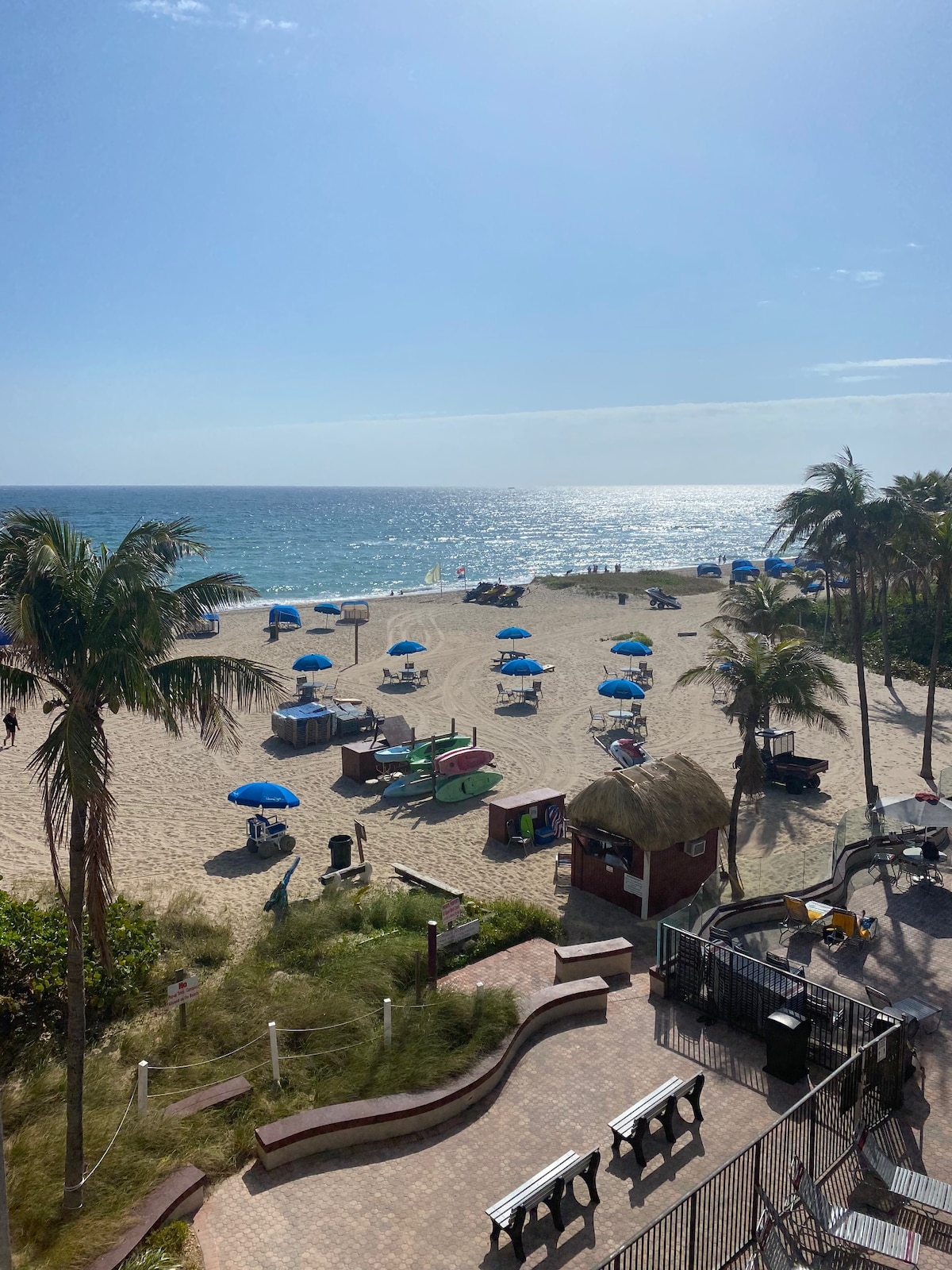 Great unit in a fabulous resort on Pompano Beach. The resort has a Tiki Bar, live music, a restaurant, water sports rentals, and a beautiful heated pool & hot tub. The views from the unit are spectacular, with a balcony overlooking the ocean. Wake up to direct ocean views, a Queen bed, a sleep sofa, a full kitchen, a dining area, a living area, and a full bath with a balcony.
