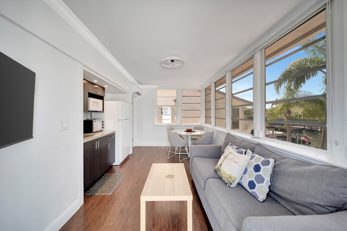 Beautiful 1 bedroom condo located directly on the intracoastal with a heated pool. This unit DOES NOT have water view from the condo BUT has amazing views of the intracoastal waterway from the patio/pool area. Enjoy watching the yachts sail by along with taking in amazing sunsets from the dock. Work from home, 1 block from the beach! Quiet and peaceful. Within walking distance to many shops and local amenities! Perfect for couples, young families and groups of friends traveling together.