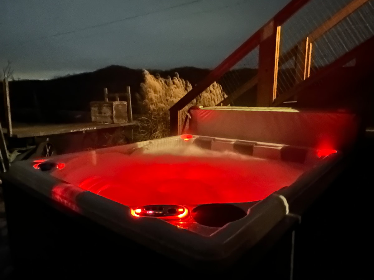 The Lodge at Treetop Retreat is a former recording studio with an AMAZING view! Set atop one of the highest hills in Brown County, this huge space boasts 20 ft ceilings in the open concept great room. With an indoor, jetted, spa tub, gas fireplace (seasonal), pool table, and lots of open indoor space, this is a cool place to unwind. King bed downstairs, and two queen beds in the loft. A front porch with porch swing, and back deck with chairs, and a charcoal grill.