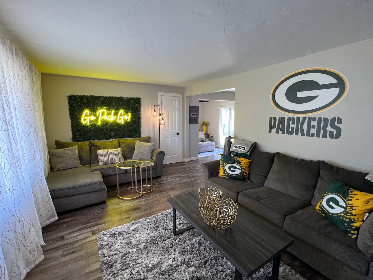 Feel at home in this bright, convenient flat—designed with you in mind. Enjoy relaxed mornings at the sun-lit dining nook and cozy evenings on the sectional after exploring nearby nature, shops and eateries. Just minutes from Lambeau Field and Downtown Green Bay, the location blends neighborhood calm with city energy—curated for comfort and connection with thoughtful touches, from comfortable king beds to built-in charging ports, complimentary snacks, wine, toiletries, and laundry access.