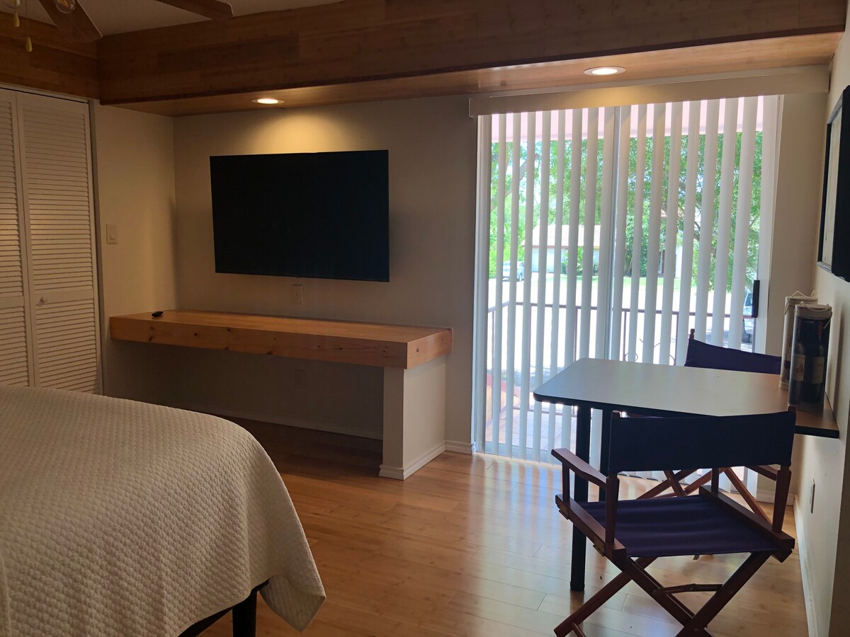 Large ,clean, bright space for work or leisure . Desk and chair , Wi-Fi, cable TV . Queen bed , bedside tables and lamps, clothes rack , iron and ironing board . Day bed to relax or accommodate another person. Kitchenette , prep area , full fridge , gas stove . microwave , Keurig, and cooking utensils . Private bathroom , with walk in shower . Private outdoor sitting area, yard enclosed. Outdoor gas grill . Discounts available for weekly and monthly rates . Dog friendly ,no cats.