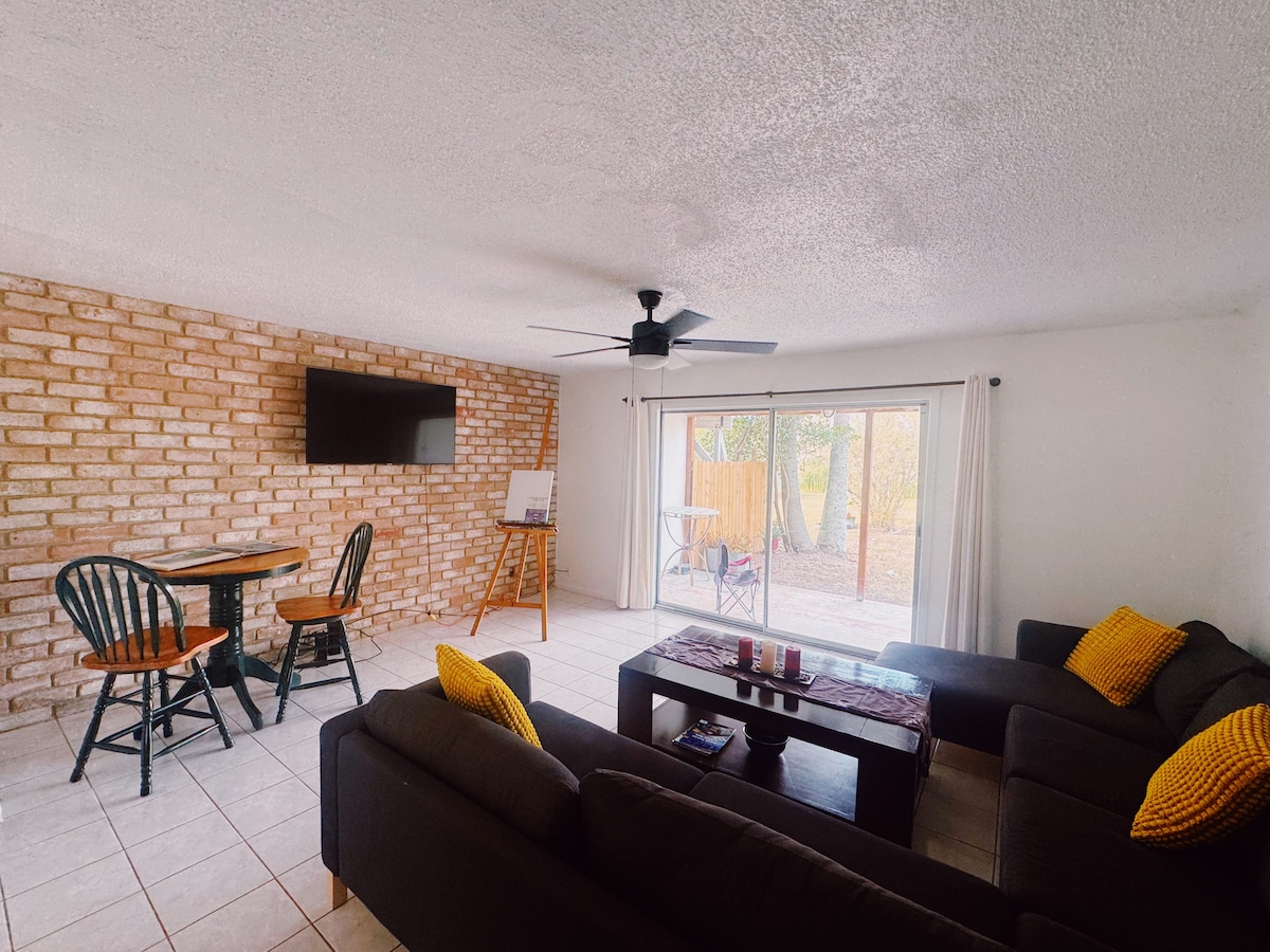 Enjoy peace, and unique views in this exclusive two-story residential suite in Rancho Viejo. Ideal for a single person, a couple, or a small family. Very close to Brownsville, Space X, SPI, Outlets, and more. A safe and quiet location that offers spaciousness and comfort, ideal for relaxing or working. It features a full kitchen, a comfortable living room that could accommodate another person or two children, a dining room, and two Smart TVs. It also has laundry facilities and free parking.