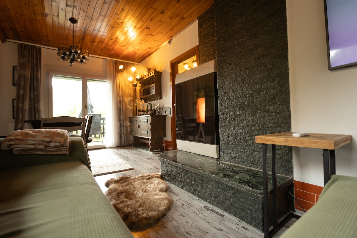 Our chalet offers enough space for relaxation! Enjoy a wonderful view from the fireplace and a feeling of freedom. Have a delicious glass of wine in the bath tub or relax and read a nice book in the reading corner of the upper floor. Regain energy in the sauna after an exhausting hike, or simply feel good in the scenic pine bedroom!