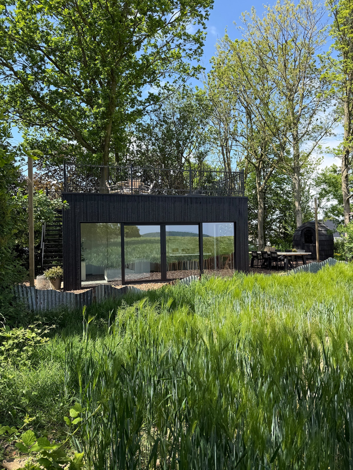 This cottage is surrounded by woods. It's the ideal place to unwind and enjoy nature. It's fully equipped with every luxury, and you can enjoy a cup of coffee or tea outside on the beautiful terrace with a hot tub. In the bathroom, you'll find a wonderful bath to unwind. The cottage is nestled in a wooded area, and we have similar properties adjacent to it, but each has its own private woodland. The minimum age for our guests is 25.