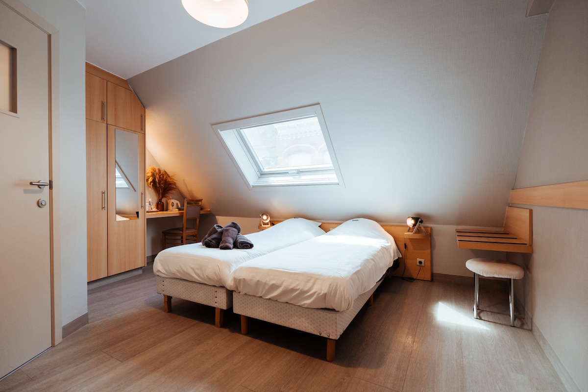 Looking for something affordable in the center of Bruges. It is our smallest most economical room and beware there is a step into the bedroom so if this is a problem with steps then this is not the room for you. Also heads up no pretty view of the canal this room overlooks the buildings in the back which are not the prettiest to look at... It's on the first floor of our self check in/out, no breakfast, no lobby but super location hotel. Its close to the elevator and is nice and cosy.
