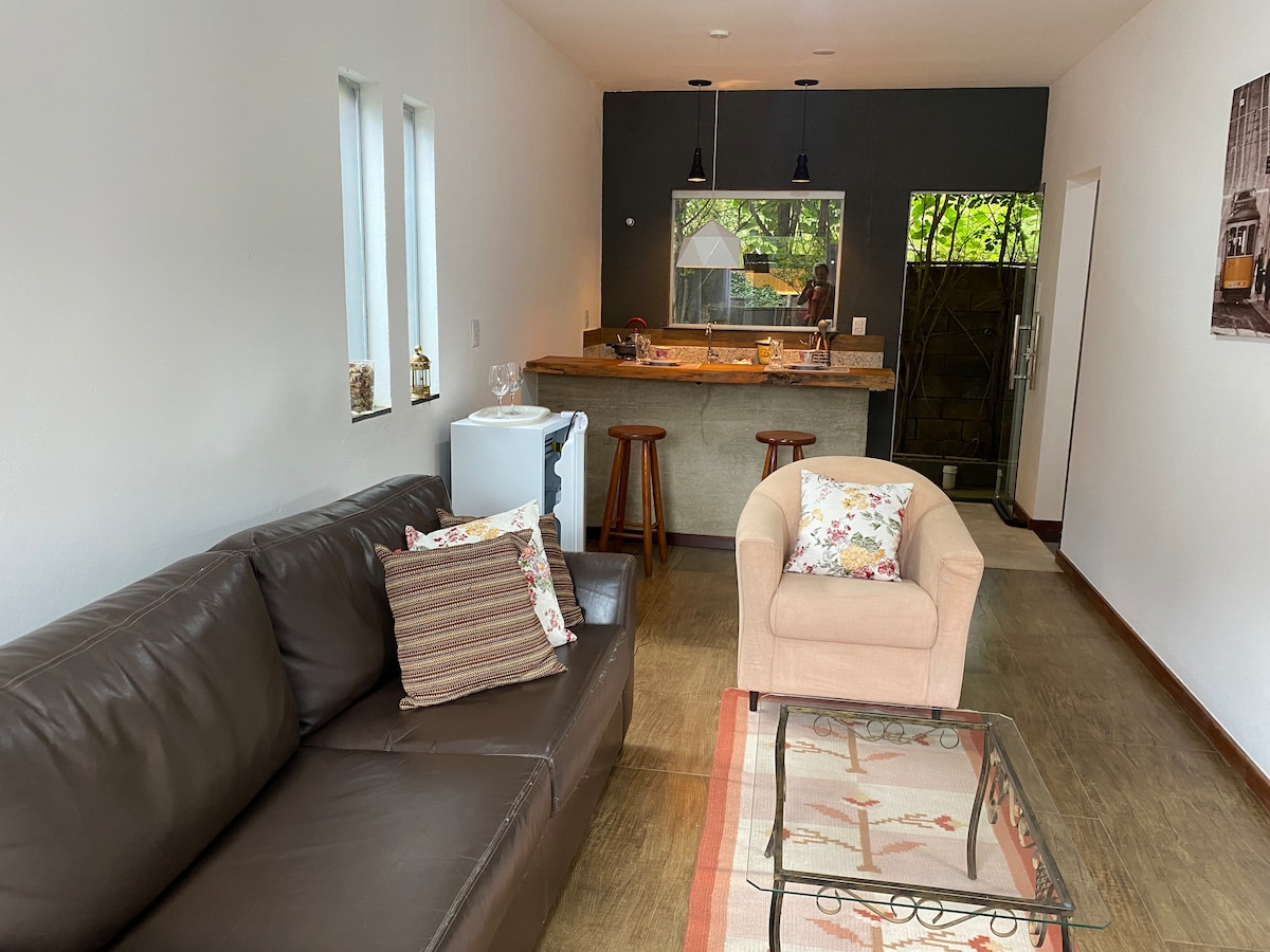 Venha se encantar, renovar e relaxar num ambiente cercado de matas protegidas, com um lindo riachinho, horta e passeios deliciosos... Uma suite deliciosa espera por você! Podemos combinar o conforto da oferta de café da manhã e outras refeições se preferir ou o acesso a toda estrutura de cozinha!