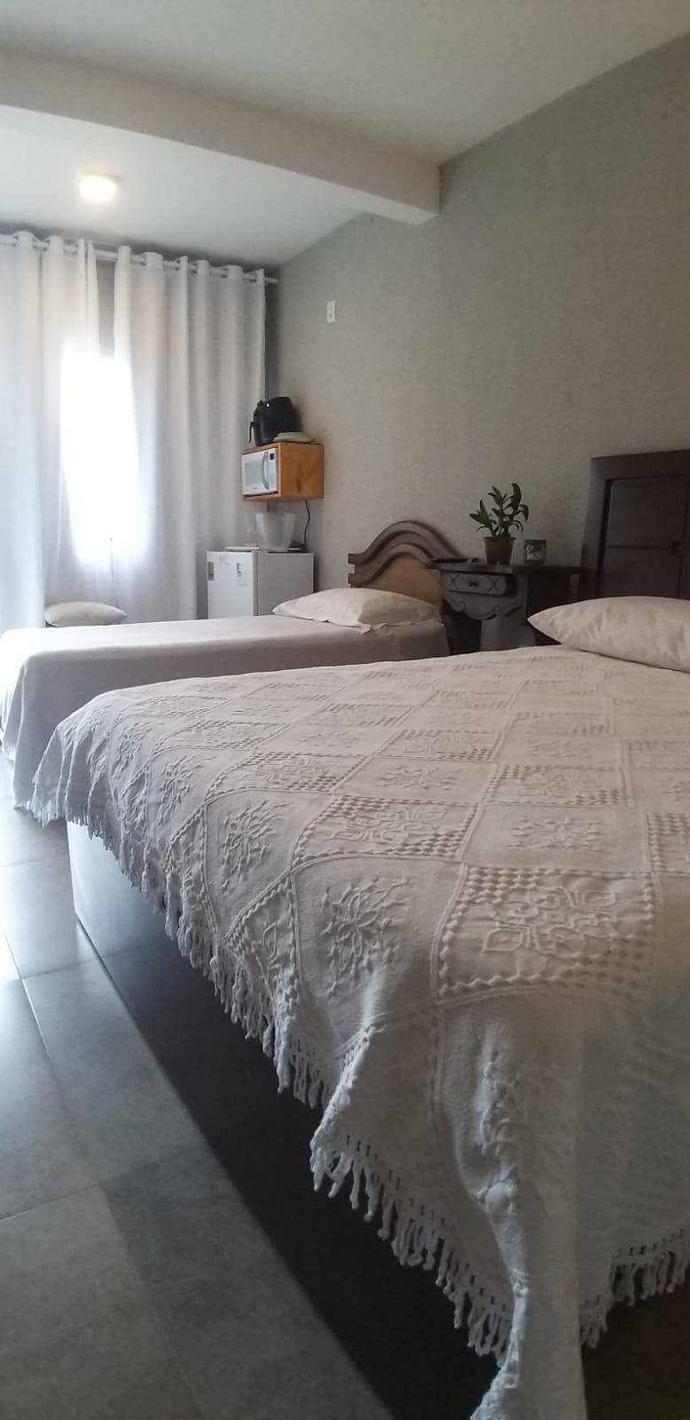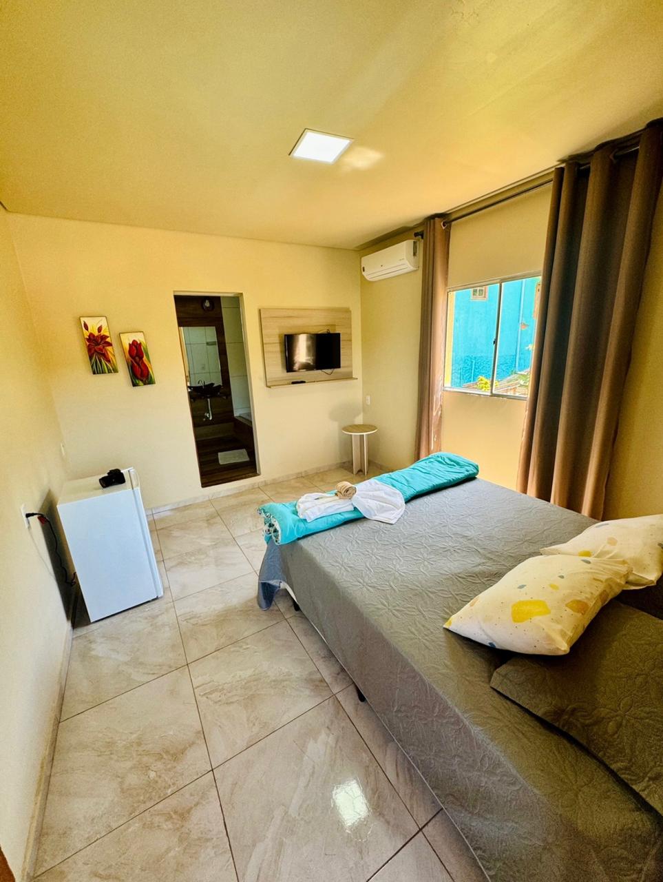 Excelente suíte com varanda, ar condicionado, TV e frigobar, para até 3 pessoas, com 1 cama de casal e 1 de solteiro.