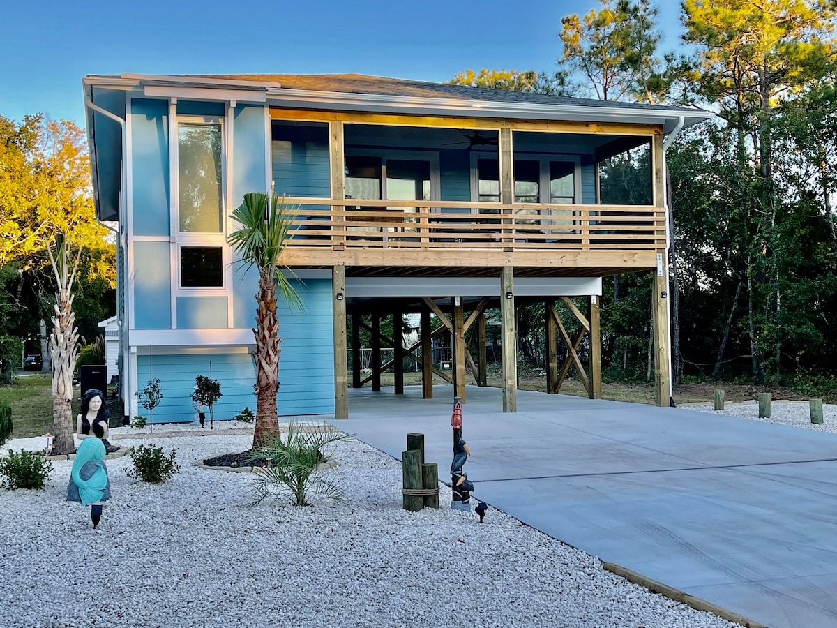 2nd row dog friendly Beach Cottage with easy access to beach across the street, view of ocean from front porch rockers. 3B/2BA, elevated home, living space on all one level with 1,076 sqft, Sleeps 6. Cleaning fee includes linens, bath, hand and wash towels, NOT beach towels. Starter rolls of toilet paper and a roll of paper towels included with rental. High speed internet, 2 Roku TVs and less than 2 miles to lots of restaurants, grocery, playground splash pad, dog park, music in the park.