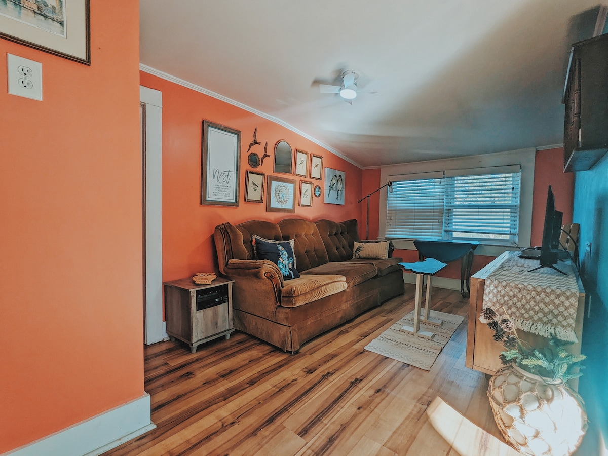 Renovated Master Bedroom Suite with shiplap walls, whirlpool tub and bidet toilet. Very Spa like and perfect for the single or couple that want to get away. Easy walk to beach., farmers market and outdoor concerts . Walking distance to eateries Your room has its own entrance on second story. Large screened in porch also yours to enjoy! We have Roku TV . New bedroom furniture and mattress with adjustable bed .