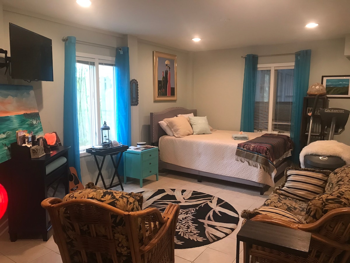 The suite is a private/guest studio (includes private entrance, full kitchen, bath and queen size bed). Designed to enjoy the saltwater pool/zen gardens. Imagine sea salt colors, Tommy Bahama style, and the artist way touch! What’s unique about this property is that you can take the sidewalk/bike path straight to the ocean (6 blocks). You can walk to restaurants, mini grocery store, and catch amazing sunrises/sunsets. This space is intended to chill. (NO KIDS/1-2 ADULTS MAX NO EXCEPTION)