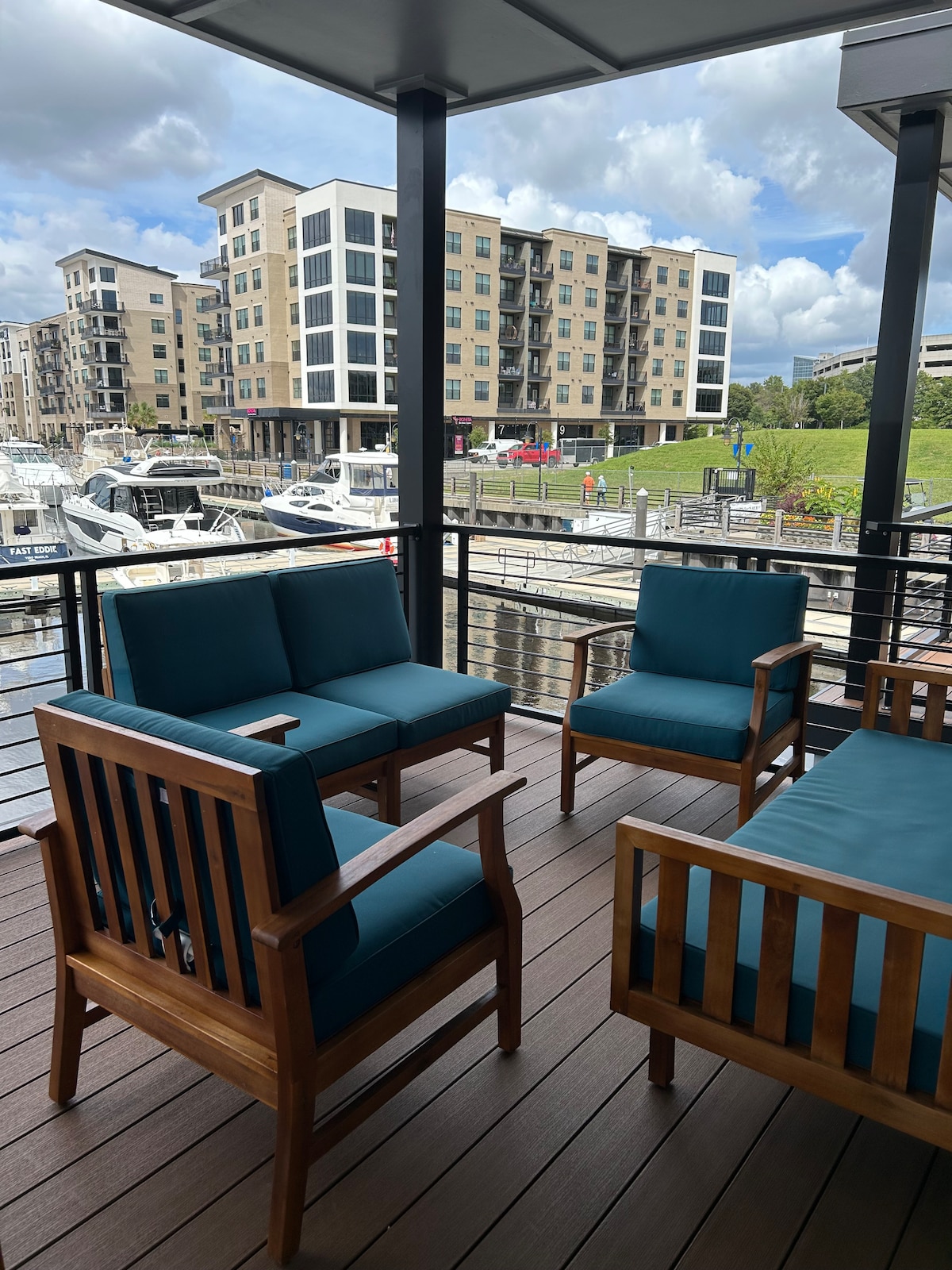 Welcome to The Cove Riverwalk Villas, Wilmington’s most unique vacation rental community! Adorned in soothing blue and cheerful yellow decor, Bliss is your haven of relaxation on the water. Offering enchanting river views that will sweep you away, this houseboat is situated at the midpoint of the dock with back patio views of the Marina. Enjoy the serene ambiance while dining at the comfy outdoor table, where every meal becomes a memorable experience in the heart of this waterfront paradise.