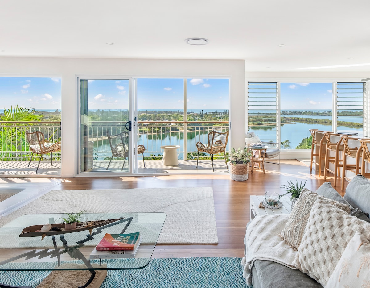 Built in the 1960’s, this classic, mid-century building survived 2 cyclones in the 1970’s, and was the original site of the first grocery store and post office in Brunswick Heads. Opposite Terrace Park, overlooking the languid Brunswick River, close to award-winning restaurants, cafes and shops, and only 100 metres from the beach, this thoughtfully renovated 4 bedroom, 3 bathroom, luxury, penthouse apartment is the ideal location for your next vacation.