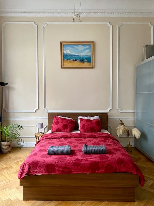The apartment on 2rd floor. Is no smoking place. Room with double bed for 2 persons. Living-room with large TV Internet Wi-Fi, sofa that can be open for bed. Kitchen with fridge, microwave, nespresso machine and all accessories for the kitchen. Bathroom with shower, toilet, and Hair Dryer. You have towels sheet shampoo at the apartment. Near the house 5 minutes walking you have big super that open every day from 8:00 till 20:00 Also Metro and tram and big area with restaurants and bars