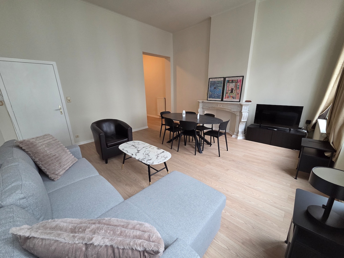 Warm and stylish 80m² flat near city heart, set in a quiet building with lift. Prime spot: 15 min to BRU Airport, steps from the train, stroll to Grand Place. Inside: Two calm, cozy bedrooms plus a single bed, separate toilet, full bath with tub, washer, dryer, fitness gear, flat-screen TV, projector, Hi-Fi, board games, fireplace. Bonus: Private underground garage just 100m away, on the same street.