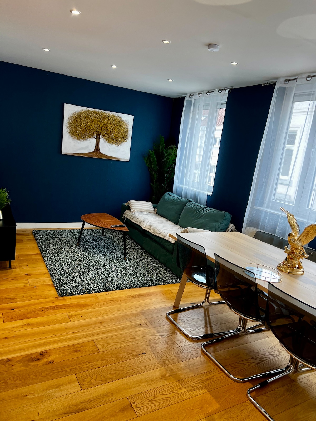 ✨ Enjoy a stylish stay in this modern duplex in the heart of Ixelles, Brussels. 🌿 Bright living room with a cozy sofa and elegant décor. 🍷 Dining/work area with a fully equipped kitchen. 🛌 Upstairs: two refined bedrooms and a modern bathroom with shower. 📍 Close to the city center, restaurants, cafés, and transport. 💫 Perfect for couples, families, or business travelers.