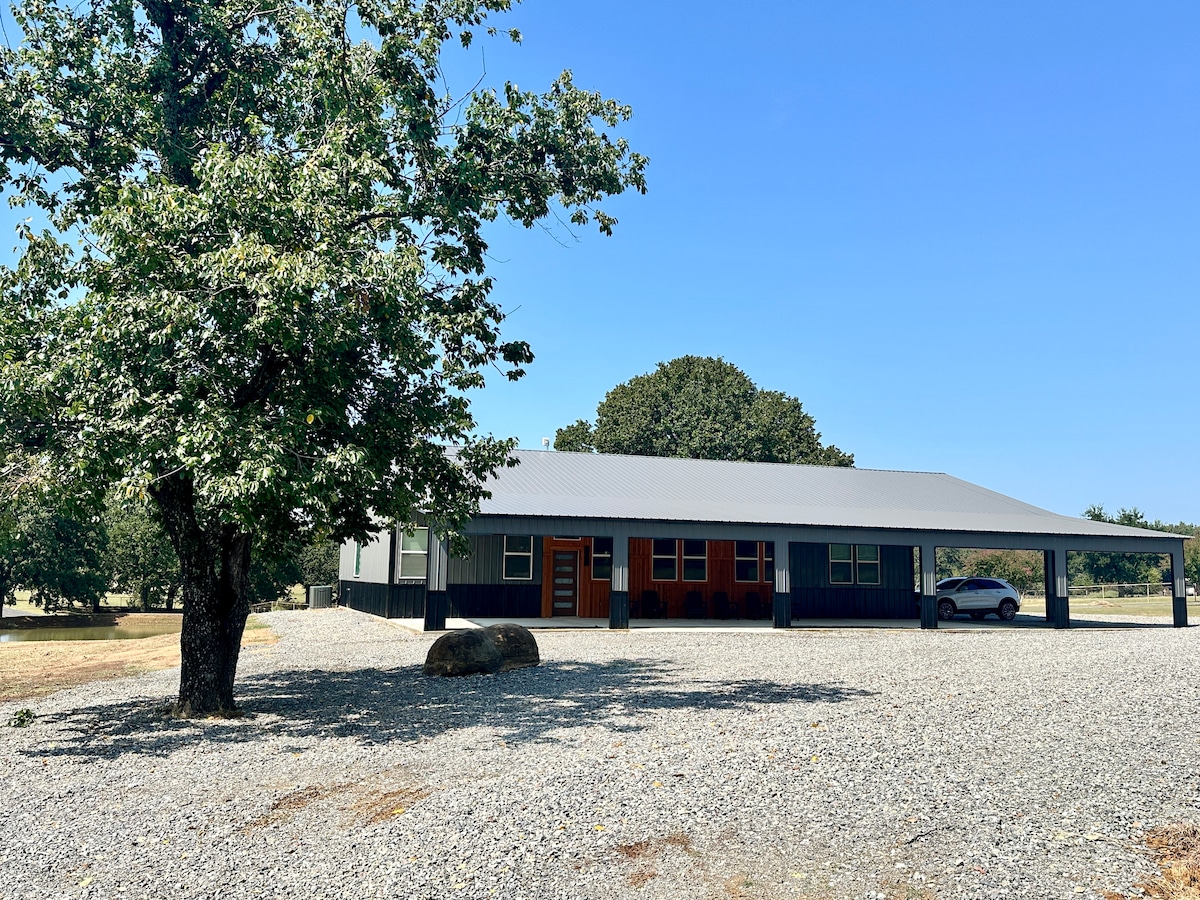 Large luxurious barndominium in a beautiful country setting right outside of the city limits. This 2,400 sqft space is open concept with full kitchen, one full size bathroom, living area, dining table, washer/dryer, ping pong table and sleeping loft. The loft has two twin size bunk beds and two private queen size bedrooms off to either side. This property is shared with two other Airbnb rentable units with a large private pond down below with shared dock. No parties over 10 guests allowed.