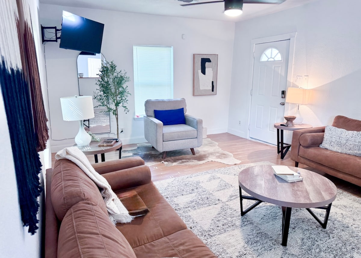 Have fun with the whole family at our beautifully modern cottage by Lake Texoma. With less than a 10 minute drive to the lake, you can enjoy water activities and various hikes during your stay. Our pet friendly cottage allows space for your fur friend in our dog enclosure complete with shade from the pecan tree. You’ll enjoy our arcade gaming corner, outdoor seating, and close proximity to Lake Texoma. Make sure to take a stroll downtown on Main St. for local shopping and dining.