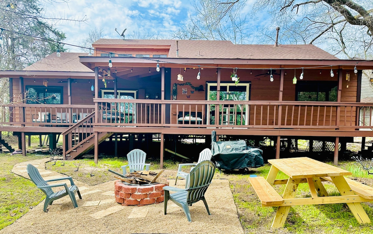 SERENE COZY CABIN nestled in the heart of Bryan, TX. Located just 10 minutes from Kyle Field. This rustic decorated 1800 sqft cabin, with the modern amenities of home, has everything you need for your perfect getaway. You can sit back and enjoy the view of the trees and small creek while sipping your morning coffee or relax with a glass of wine on the expansive back porch.