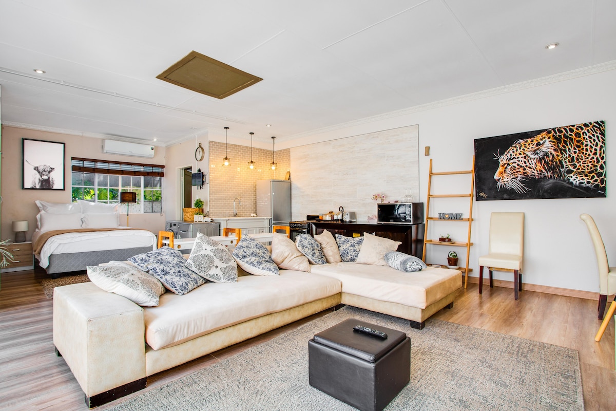 Fully furnished modern, self catering secure and fully equipped private studio apartment, with solar power, so you will not be affected by power outages! Situated in a quiet safe neighborhood, close to all major shopping malls and entertainment areas. The space is safe, calm and stylish, newly renovated and perfect for business persons or travelling couples. Please note that this apartment is strictly no smoking. There are very friendly dogs on the property which love to greet guests on arrival.