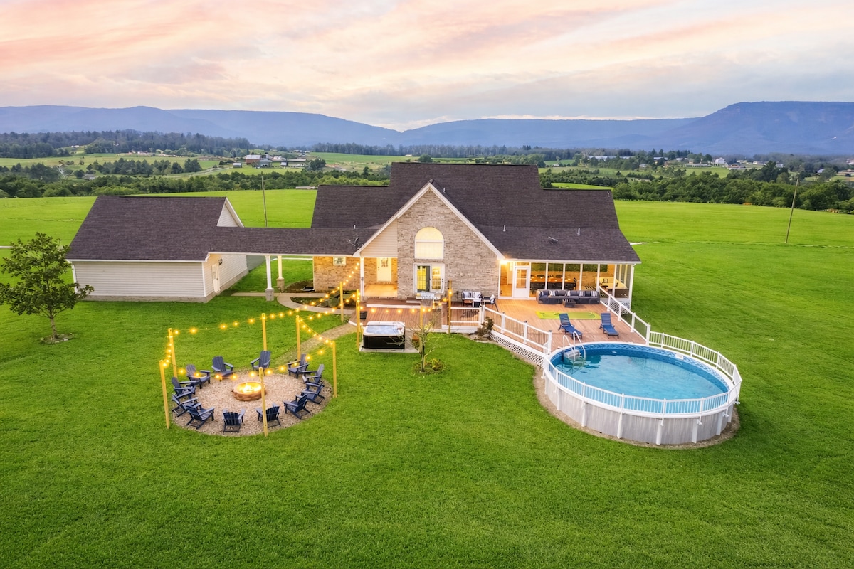 Make some memories at this unique, family-friendly space. You will absolutely fall in LOVE with the views as you sit on the patio overlooking the heated pool (Apr-Oct), hot tub and the mountains. This totally private, 4 bdrm, 3.5 Bath house will make your vacation a dream! You can spread out in the lower family & game room or upstairs in the open kitchen and living room. Enjoy sunrises and sunsets on the porch or sit around the campfire and roast smores! This is truly a Shenandoah Valley Oasis!